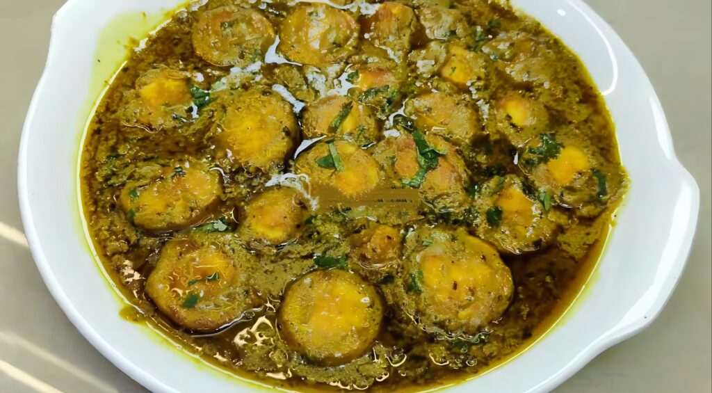 Heat **2–3 tablespoons of oil** in a pan. Dip each egg slice in the egg mixture and coat it well. Fry the eggs on both sides until golden brown. Once done, set them aside.