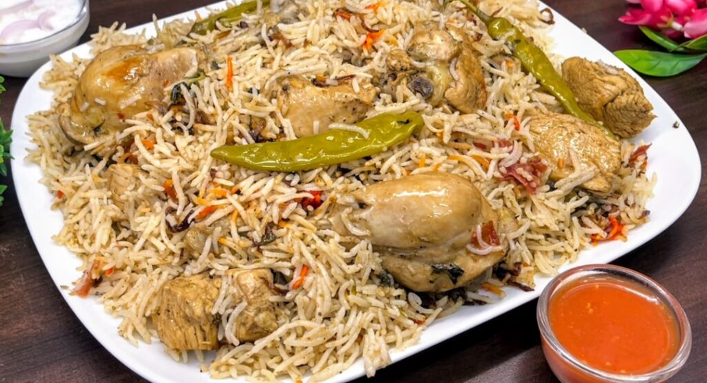 After 15 minutes, open the lid, and the Hyderabadi Chicken Pulao is ready to be served. The rice is fluffy, and the chicken is juicy and tender. You can serve this pulao with kachumber, raita, or chutney. It’s a very simple recipe that gets ready quickly.