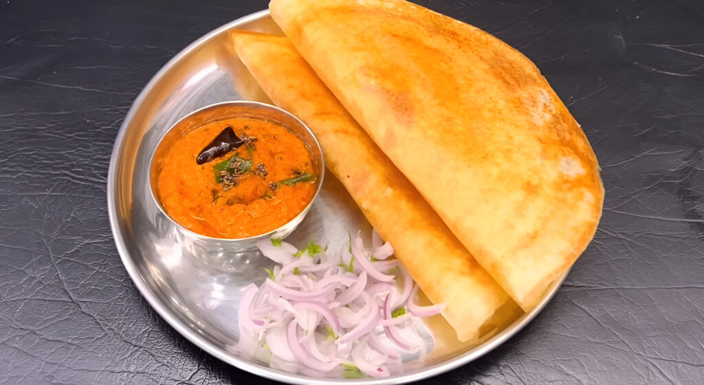 Serve the crispy dosa hot with the red chutney. I’ve also served it with a little bit of **sliced onion**, just like it’s served in South Indian hotels. This instant crispy dosa with spicy red chutney is absolutely delicious!