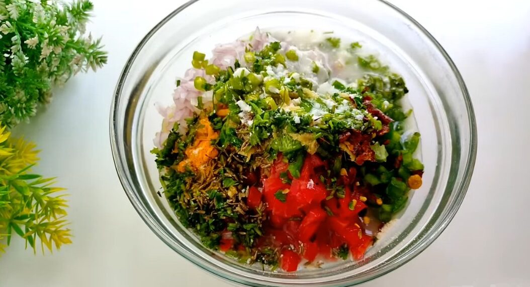 Now, gradually add water and mix everything to make a thick batter—something similar to pakora batter. Let the mixture rest for 5 minutes so the semolina can absorb moisture and fluff up.