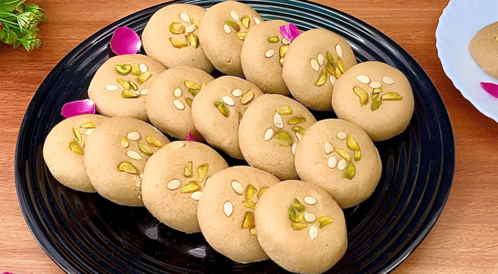 Here’s how the sweets look after shaping them! They’re soft, smooth, and full of flavor.You won’t believe that these sweets are made without condensed milk, mawa, or sugar syrup. They’re that delicious and easy to make!